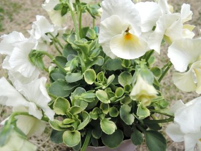 パンジーの斑入りとしては珍しい新芽の葉緑素が少ない曙斑です。葉が成長すると普通の緑の葉になりますが、途中では覆輪のようになるため、なかなか見応えがあります。花色が白に近いのが残念なところですが、それ以上に授粉を試みても種子が採れないまま暑くなって☆になったのは非常に悔やまれます。