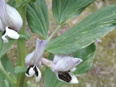 野菜のソラマメですが、斑入りとして葉に白の砂子斑が散ったものです。一応は珍しい斑入りになると思いますが、パッと見では斑入りと分からない地味な斑ですし、病気であるウイルス性の斑入りのようにも見えます。そのため採れた種子を蒔いたところ