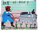 このペン・スクールでサム・ドイル の才能が発見された。1994年か ら描きはじめた島の歴史、伝承、人 物など、「人間の精をを描き」続け ている。貧困ゆえのブリキ缶を延ば したキャンバスに家屋用のペンキで 描かれた絵は、画中のタイトルとと もに異彩を放つ。画材は常に常軌を 少し逸した人物であり、タイトルも シンプルかつユニークである。素朴 ながらも辛辣な観察眼が鋭い。 | ||||||||||||||||||||||