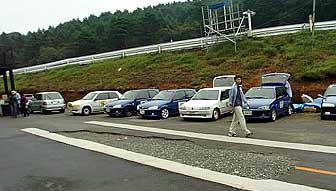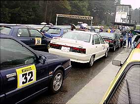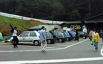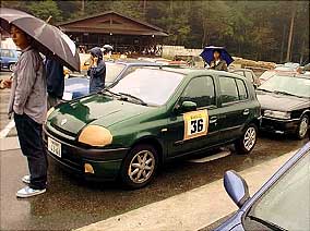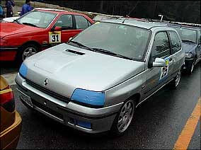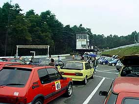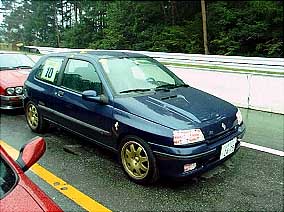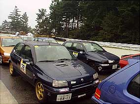 | Clio達です。 上の写真のClioの後ろに見える丸目の車が今回唯一のイタ車アルファロメオのアルフェッタGTV6です。 今回Clio&Luteciaの走行台数は9台だったんですが、残念ながらグループはできなかったようです。 大体同じくらいのラップタイムを刻める車同志がグループになるよう設定されているそうです。 | |