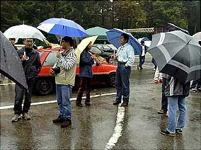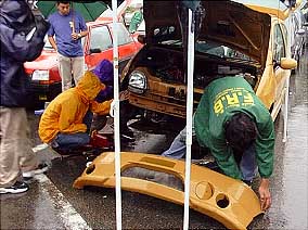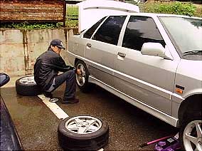 タイヤをSタイヤからレインタイヤに交換する某クラブの代表。
