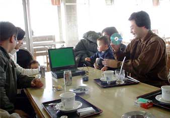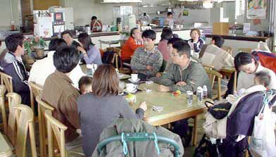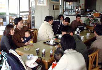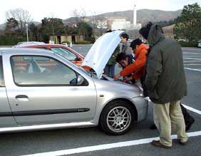 | 外では何ですので、近くのクラブハウスでお茶でも? おや、うどんを食べている人に、 歓談のあとワッキーさん制作のトゥインゴオフ会のプロモーション映像も見せていただきました。 3時半頃にはクラブハウス閉店のため追い出されまた駐車場ヘ。 |