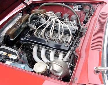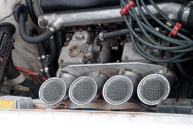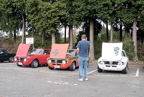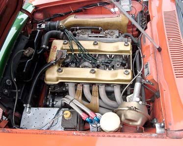 |  | 見慣れたアルファのツインカムですが、ハイテンションコードが8本、スパークプラグが2本ずつ配置されたツインスパークなのでやはりGTAに間違いなさそうです。 |