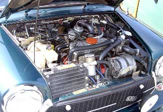 エンジンルームは手も入らないぐらいいろんな部品でいっぱいです。 エアコンも付いているようですね。 |