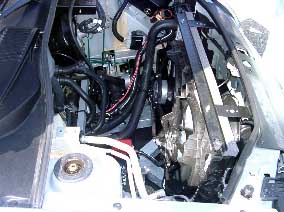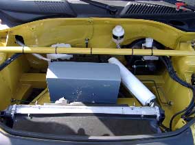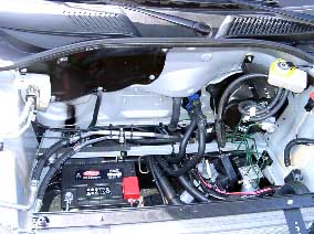 | クリトロのボンネットの中はシンプル、V6は空調、エアコン等の配管があります。 でも荷物を入れるようには出来ていないようです。 | |
