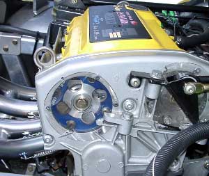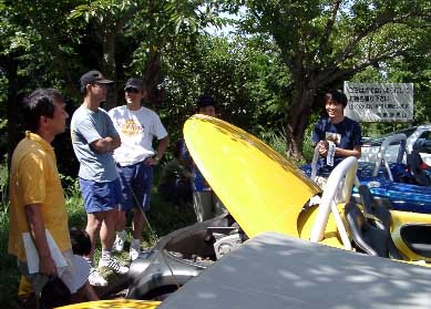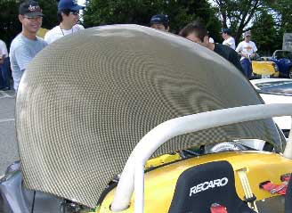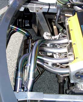 |  | このタコ足すごいです。 チタン製だそうで曲げが絶妙に綺麗です、なぜこんなに綺麗な作品が出来たのかと思ったらやっぱりバイクのマフラーを造っている方の作品だそうです。 横のパイプ同士をバイパスする手法、これもバイクでよくやります。これで低速トルクがアップするんです。 カム角はアジャスト出来るようになっていて、覗き窓までついていました。 またリアのボンネットはカーボンケブラーで軽量化していました。 |