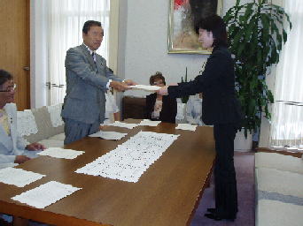 来年度の予算要求をしました 10月4日、9月市議会の終了後、白井市長に来年度の予算要求をしました。私は、本会議の終了後、すぐに「議会だより編集委員会」が開かれたので、参加できませんでしたが、市議団の8名連名で申し入れました。 市政課題や、選挙で訴えた公約、市民要求の強いもの、またJR事故やアスベスト問題も含めた要求書を市長に手渡しました。 |