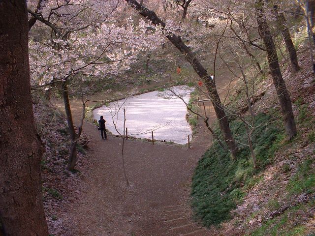 池の水の上に花びらが積もって、桜色の池になってた
