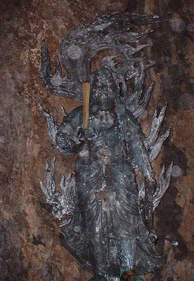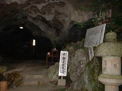 | 洞窟に入ると涼しくて良い感じ 特に今日は蒸し暑かったし 内部にある温度計を見ると13℃を指してました。 5分も歩けば 終点、終点に付く頃には肌寒いくらい こちらの不動明王さんは奥よりちょっと手前にいはりました。 お不動さんの横に不動の滝ってのがあったんだけど フラッシュが水飛沫に乱反射して撮影失敗 (T_T) 長寿の水と書いてあったので一応味見はしておいた | ![]() |